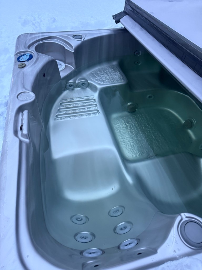 Upptäckte att spa poolen tömt ut vatten till hälften å det blev verkligen en blöt surprise när jag öppnade locket, å vattnet sprutade ut över mig. Monterade bort luckan i trallen för att dra ut strömbrytaren. I vår blir det att såga sönder och frakta bort hela åbäket.