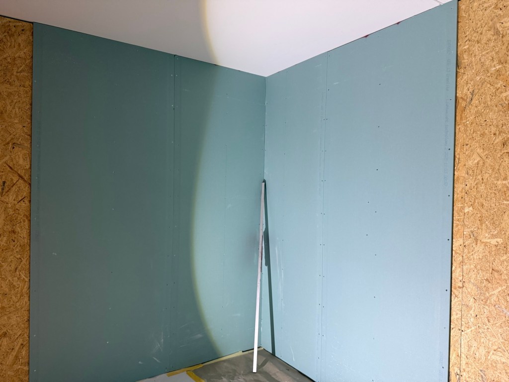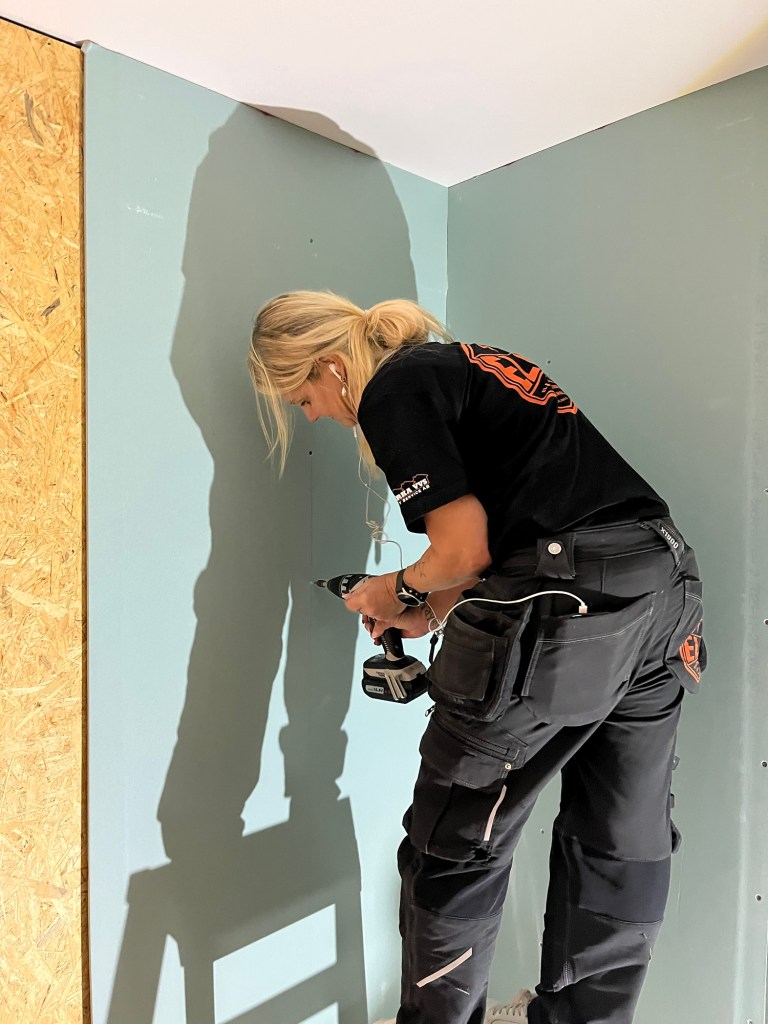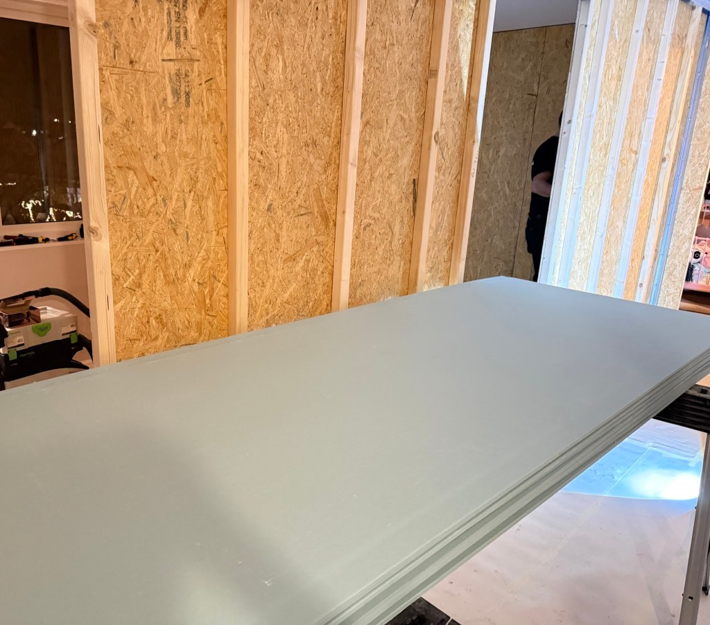 I rosa huset gipsa vi alla väggar och förstås bar vi även upp 10 skivor gips en våning upp….phu! För att det skulle gå fortare så tog vi två skivor i taget. Det känns nu i både armar och ben!!