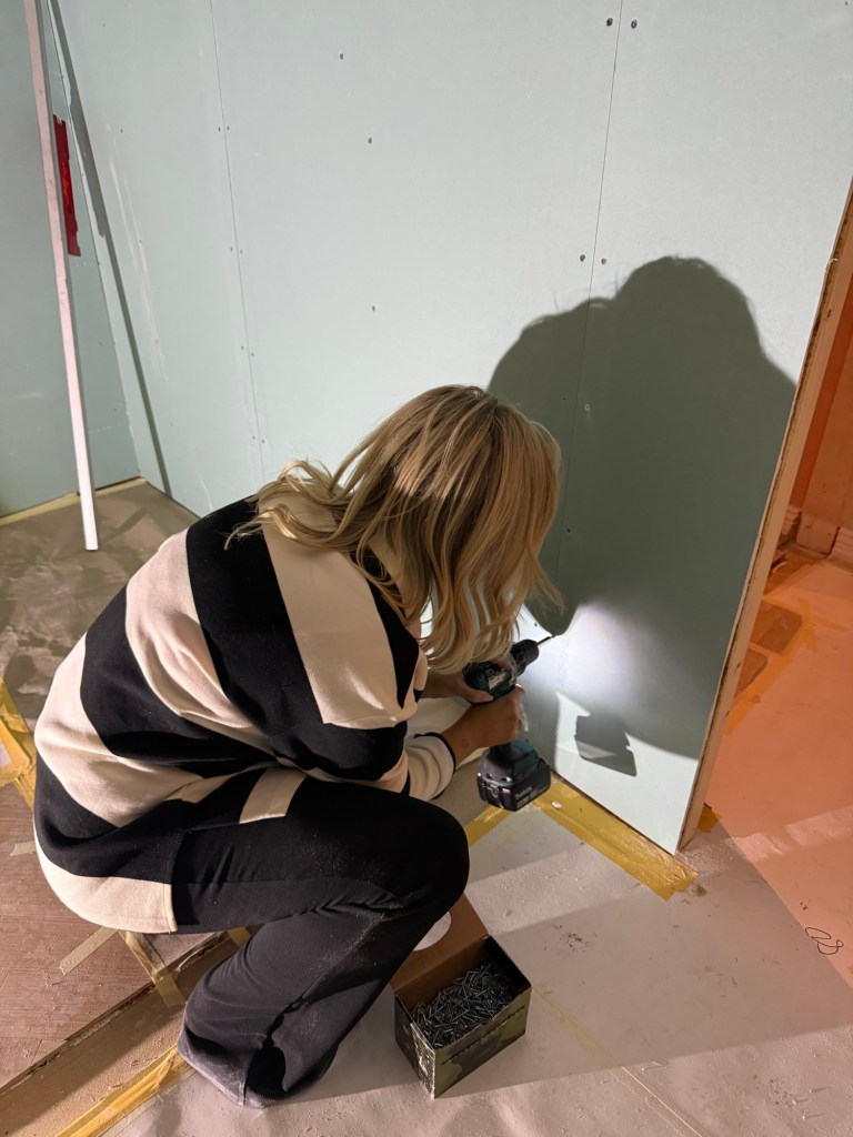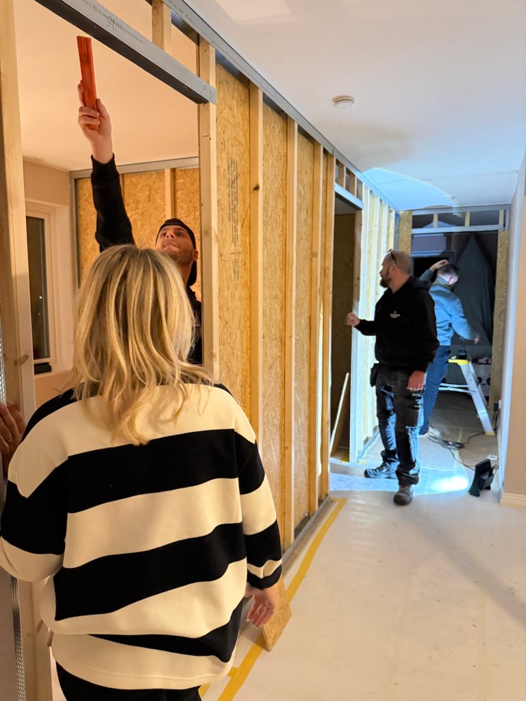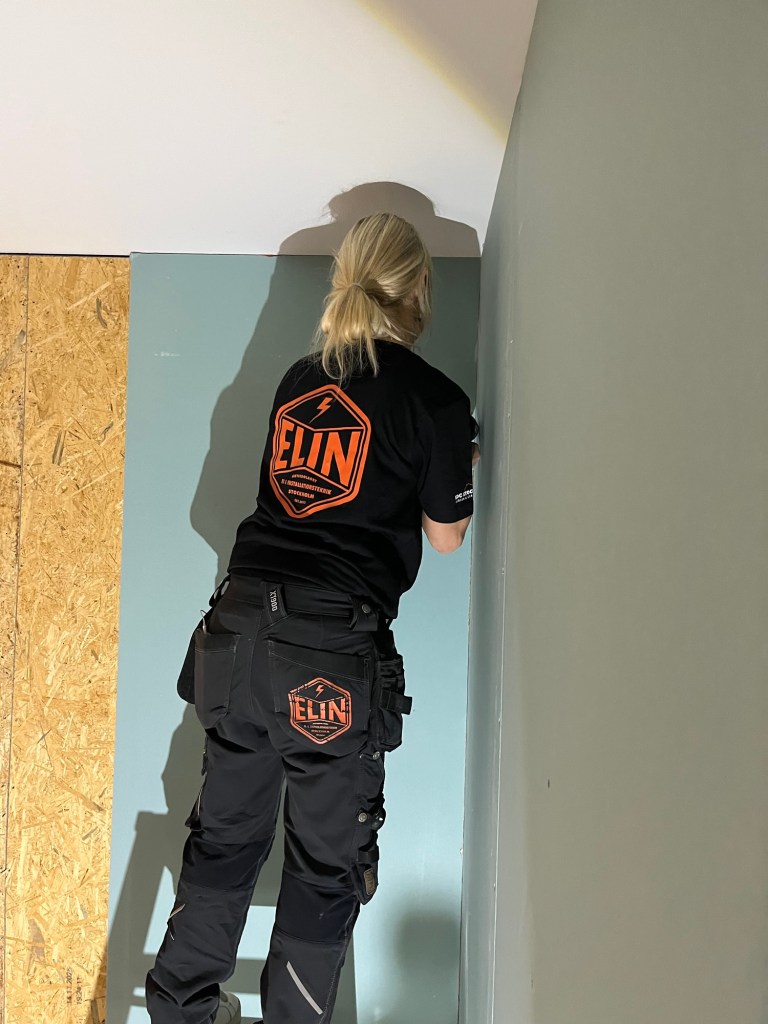 Två rum blev klara. Emil var på plats och mätte ut hur elen ska gå.