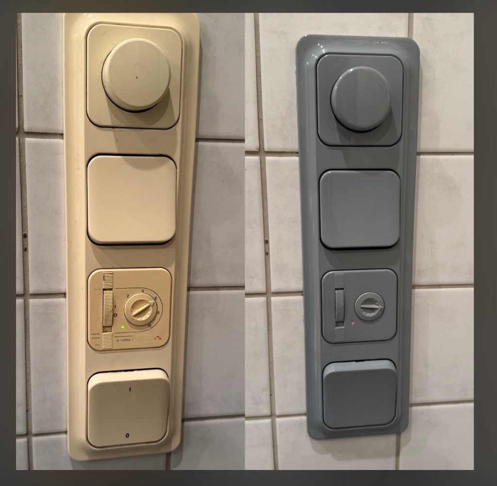 Det blev målning för mig på morgonen, mitt egna lilla projekt i badrummet. Fläkten fick en ny färg, precis som knapparna till belysningen. Det blev en ganska stor skillnad på knapparna efter målningen. Man märker inte hur gula de är, när man ser dem varje dag. Blir liksom en vana. Det är bara i badrummet uppe som knapparna har fått den gula färgen. I resten av huset är de vita. Man kan nästan tro att någon kedjerökt i badrummet.