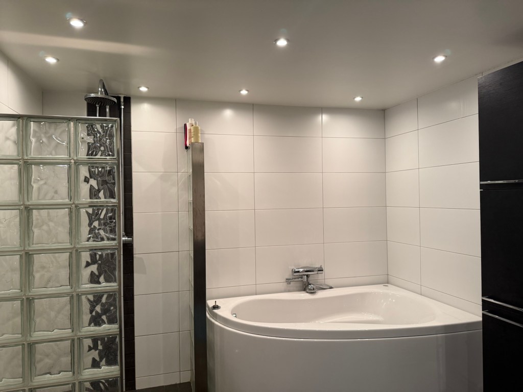 Dimmern i badrummet lyste bara svagt, så vi behövde slå av säkringen för att kunna byta dimmer. Säkring efter säkring slogs av, och när alla säkringar var avslagna, var det mörkt i hela huset förutom i badrummet, där det lyste…ett mysterium! Så det var bara till att slå av huvudsäkringen och ta fram ficklamporna för att få jobbet gjort, men vilken skillnad med takbelysning…