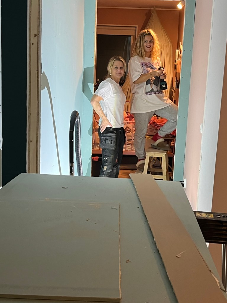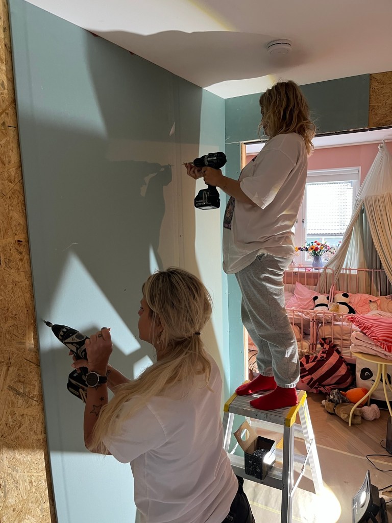 Lassie kapade upp skivor och Hanna å jag skruvade fast. viss skruvar blev också inte 1 mm in i skivan utan målaren kommer få spackla 🤣