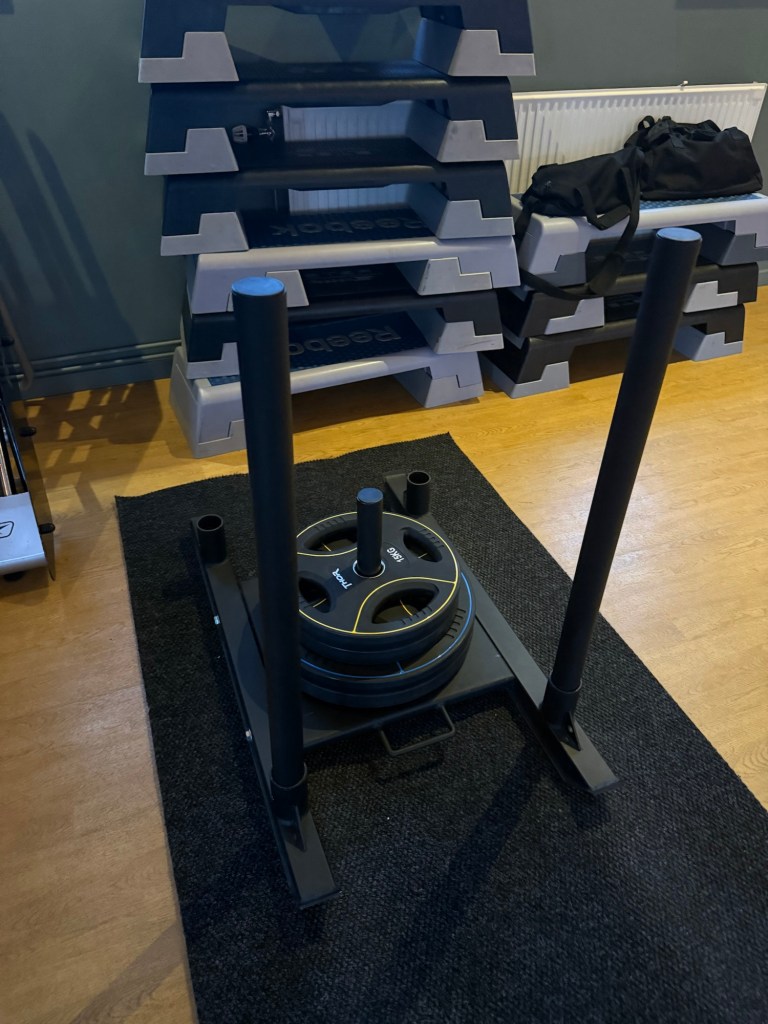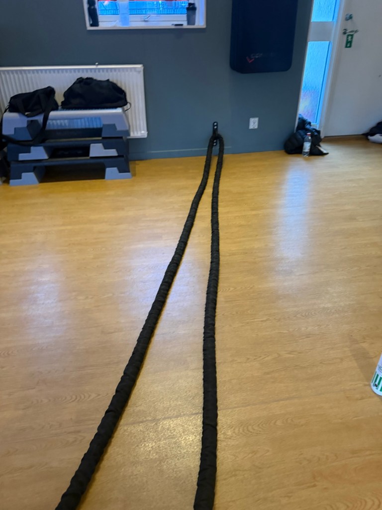 70 kg vikter som ska dras genom hela salen, fram och tillbaka.