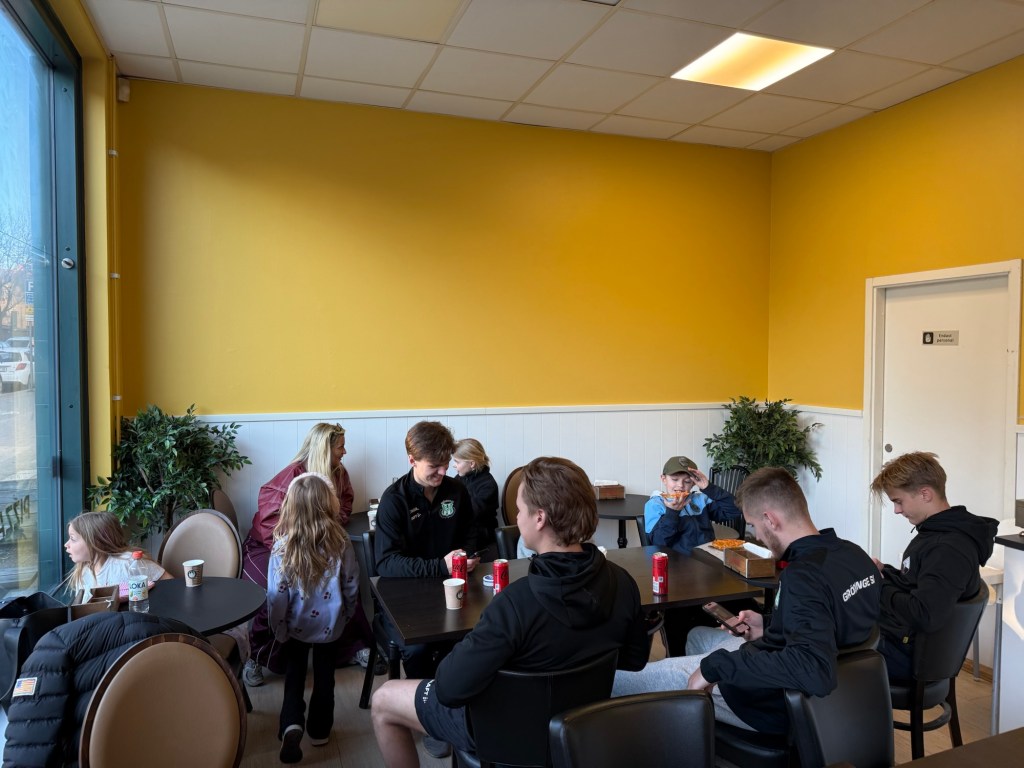 Efteråt åkte vi vidare mot sushi. Alla beställde varsin rätt, förutom Vinns som bestämt ville ha pizza. Så vi tog med oss våra sju portioner sushi till pizzerian bredvid. Kändes kanske lite sådär att sälja en barnpizza när resten av gänget satt med mat från grannen… men så anslöt Elias och Viggo upp, tillsammans med kompisar, och de beställde mat från pizzahaket. Då jämnade vi ut det hela lite ändå.