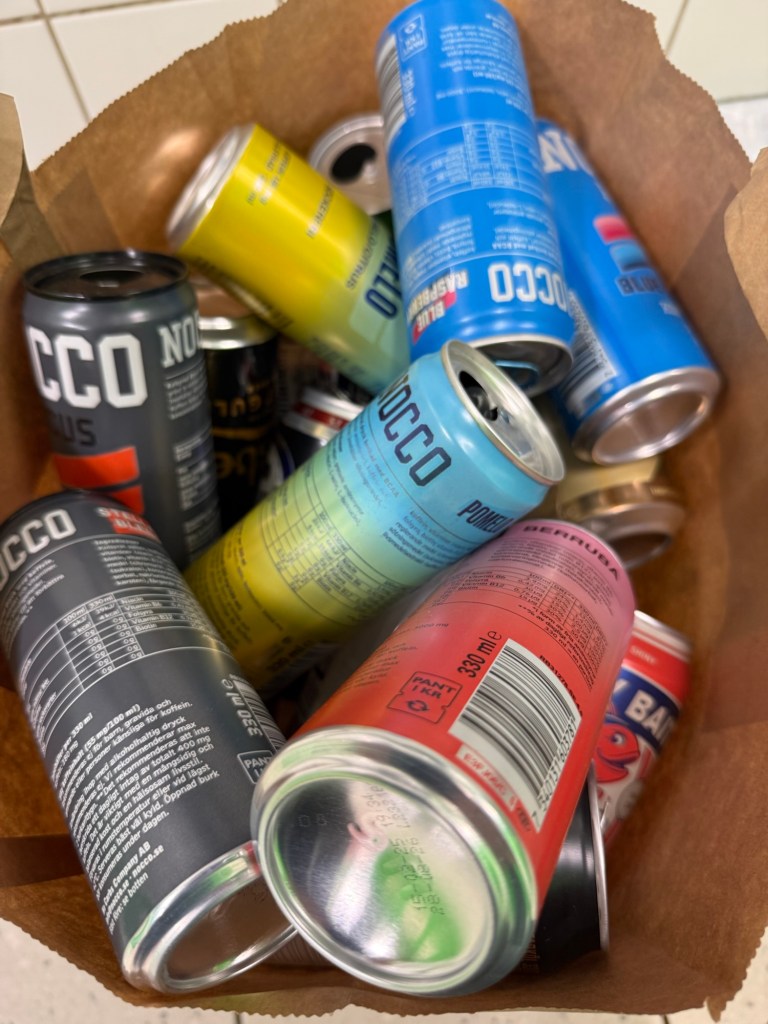 Försöker hela tiden bli av med panten så snabbt det går, men kassen fylls på i rasande takt varje vecka. Största delen består av Viggos alla Nocco-flak, som dominerar i pantpåsen. Söndagen ägnades därför åt en runda till pantmaskinen – och även ett besök på tippen för att bli av med skräp.