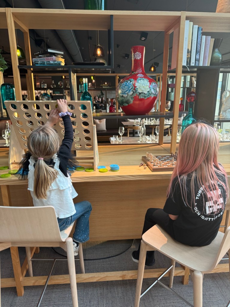 Lite lek på hotellrummet med både bad i badkaret och spel med egengjort gjort memory av Lykke.