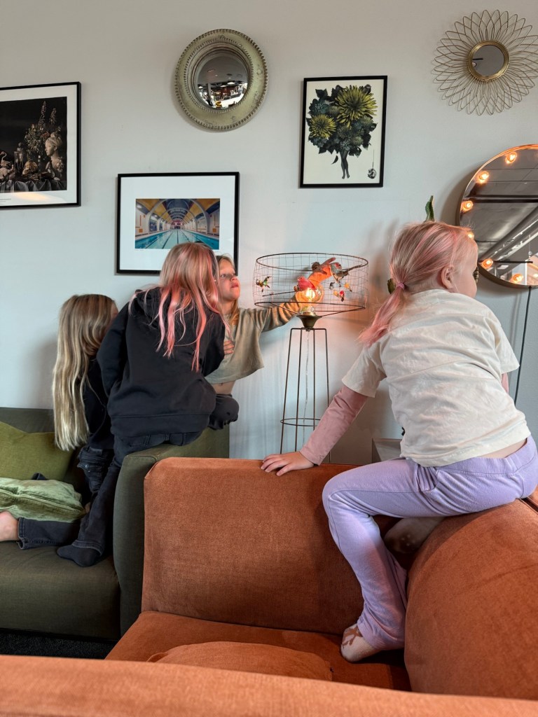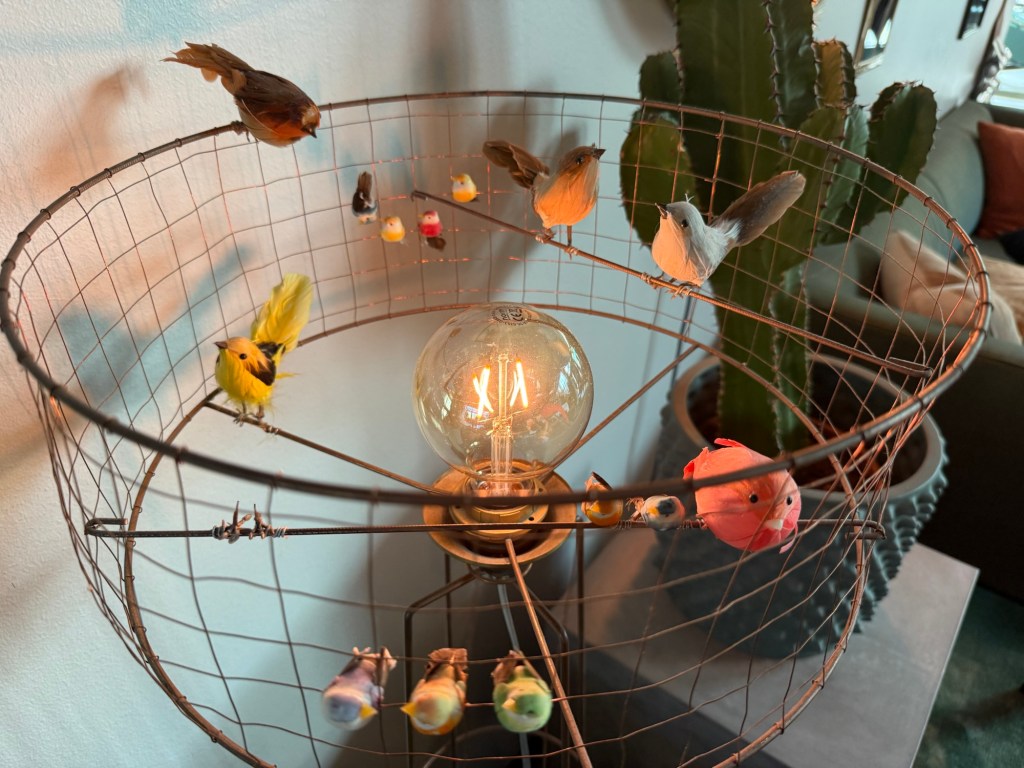 I lobbyn har de en lampa med en massa prydnadsfåglar, som nu har blivit döpta.