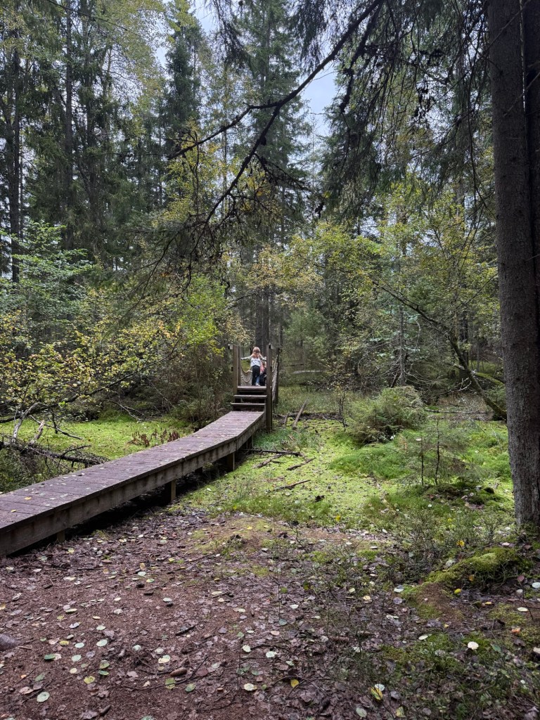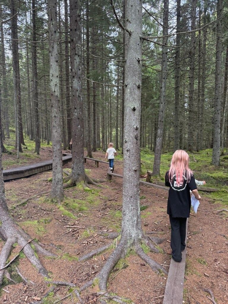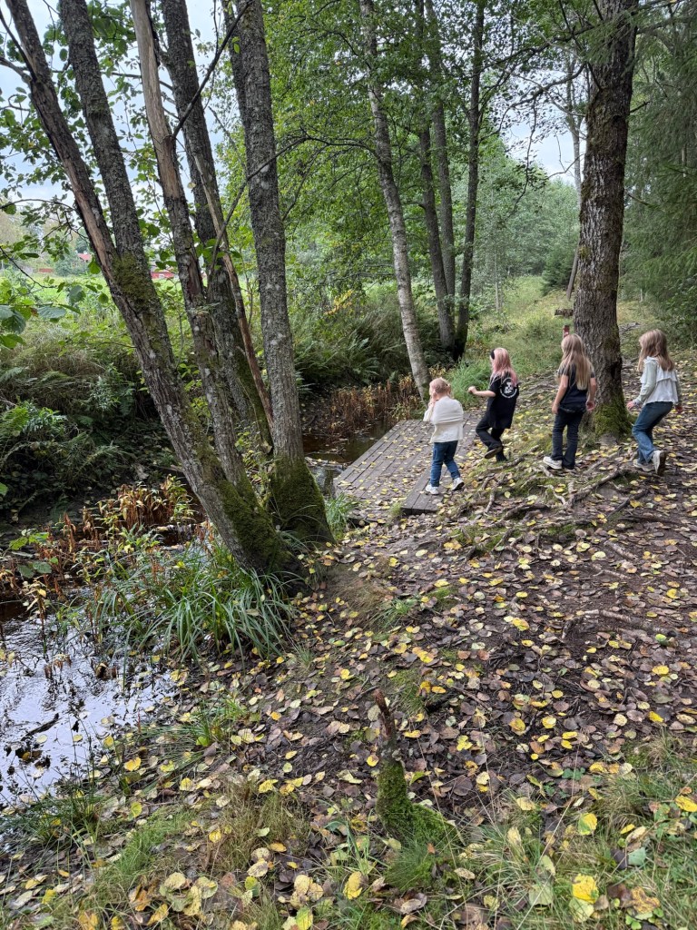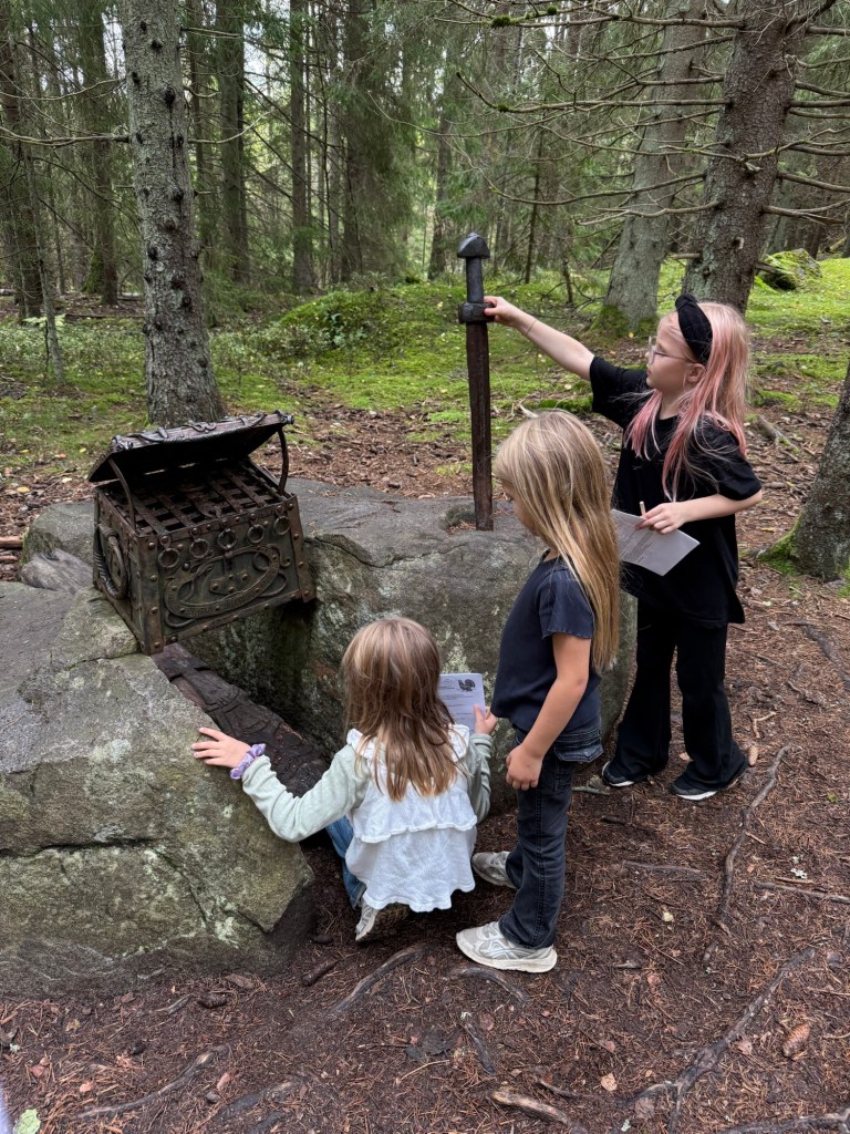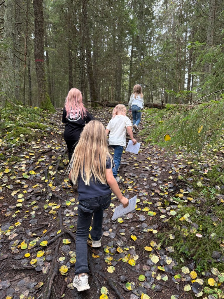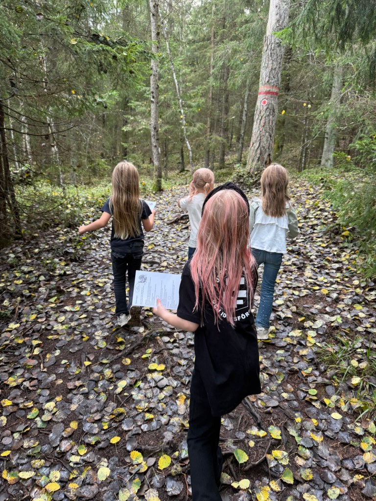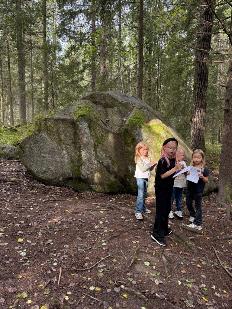 Vidare till Tjäderstigen i Tyresta by för tipsfrågor och tipspromenad samt att det fick lära sig massor om vikingar, inlandsisen, asagudar, natur och djur. Vi träffade även på några hundar och svamp plockare.