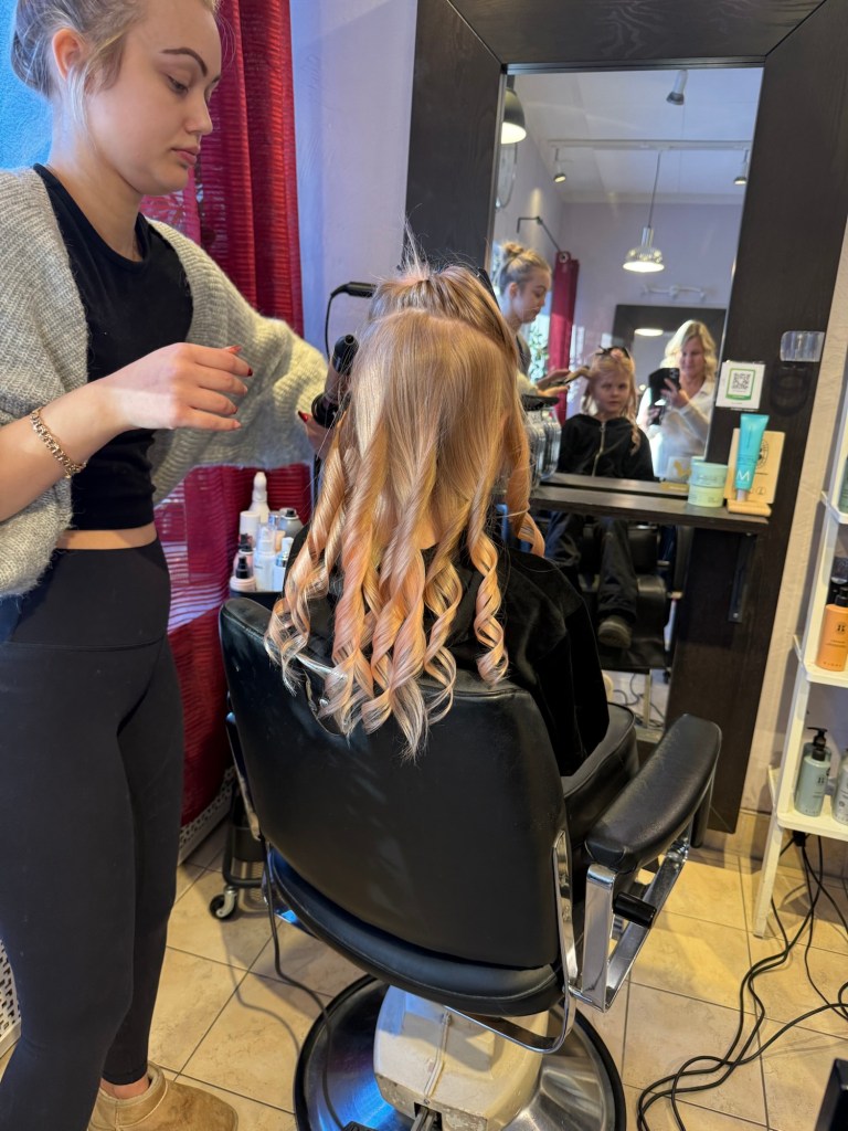 Medan Malin lockade sitt hår fick jag sitta i en annan frisörstol medan tjejerna låtsades vara min frisör.