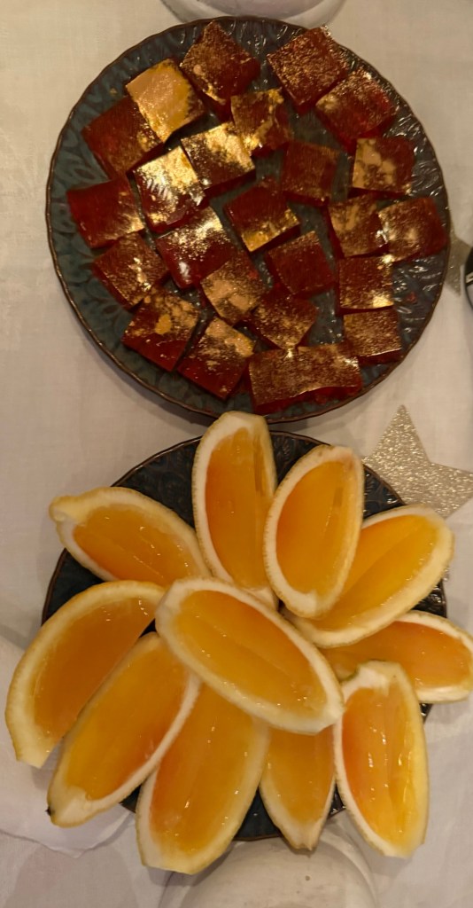 När jag ändå höll på så fortsatta jag med en jello med briska och vodka. Den ska skäras upp i tärningar med guldpulver på.