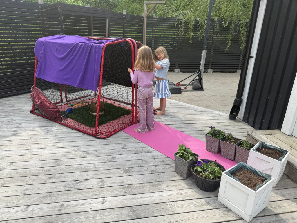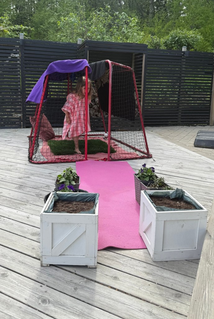 När man inte har en riktig lekstuga, så blev det en egen byggd av tvillingarna, med blomsterallé och rosa matta.