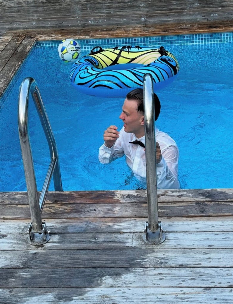 Efter utspringet blev han nedsprutad med bubbel av ett gäng kompisar tills han var genomblöt.