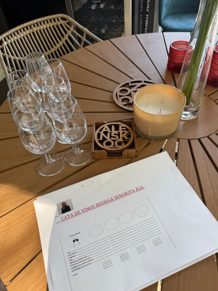 ”Casa de Vinos Bodega Senorita Åsa” med vinprotokoll och glas med 5 cl märkning.