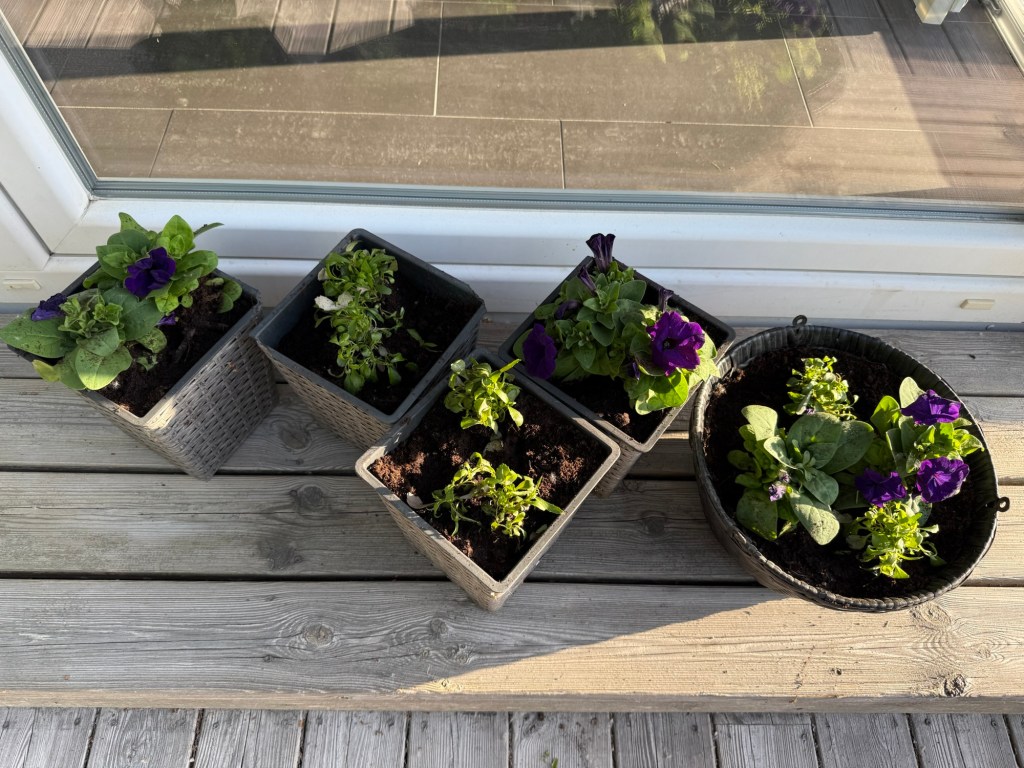 Det blev super enkelt, en bytta med blå lobelia och två byttor med rosa och lila penséer.