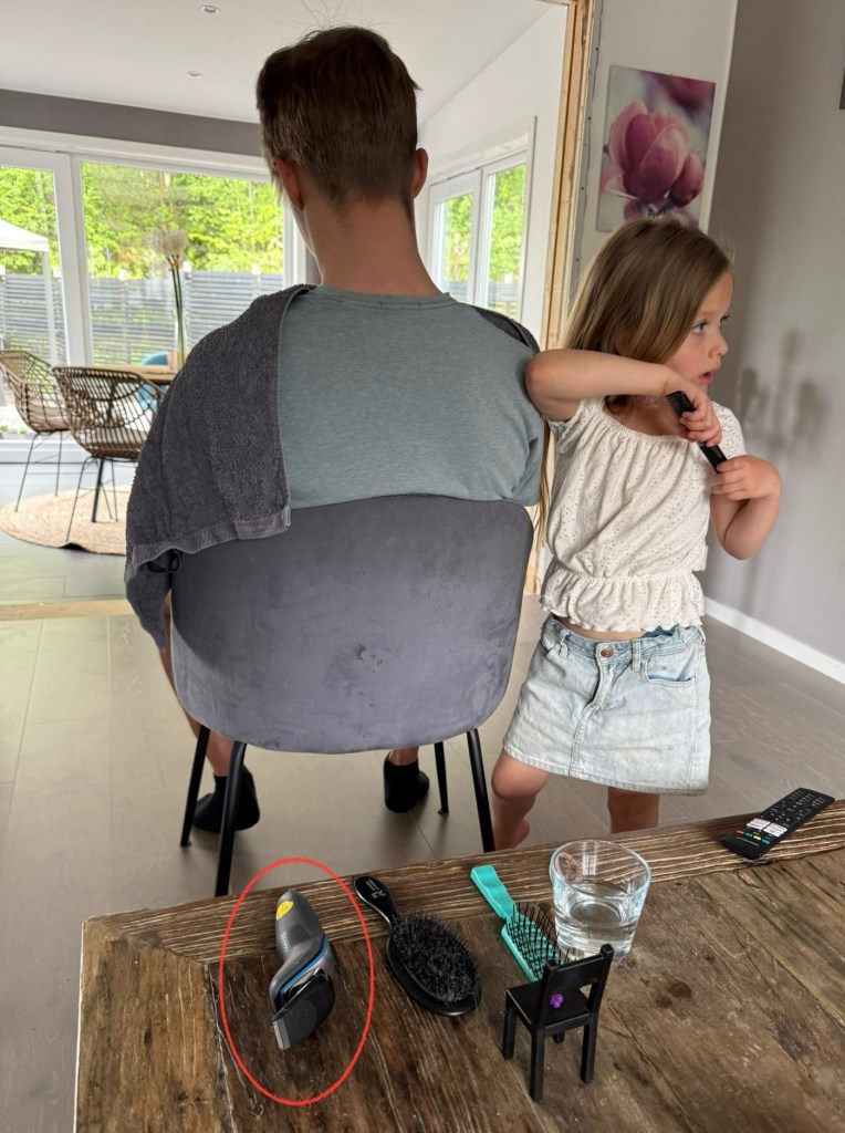 Han är nog inte helt medveten att den lilla frisören har en rakapparat i sortimentet.