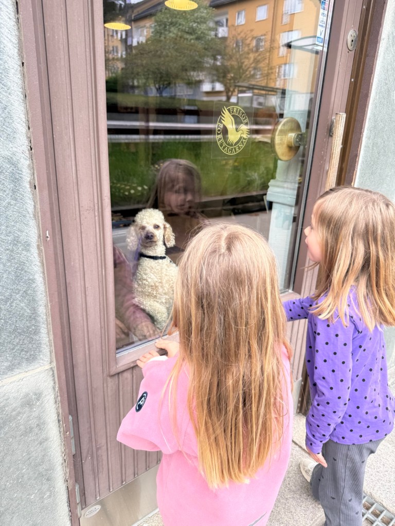 Trissen fick efter hämtning följa med till frisören, då jag behövde sätta tillbaka två extensions som ramlat av. De roade sig med Aston medan Amanda fixade.