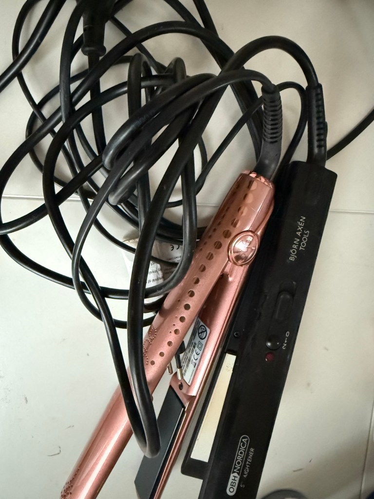 Min plattång började glappa för ett tag sedan, och ungefär samtidigt ville min storasyster göra sig av med sin. Jag fick hennes, och kort därefter skaffade en kollega en Dyson – så jag fick hennes plattång också. Som om inte det vore nog började min gamla, glappande plattång plötsligt fungera igen. Nu står jag här med tre stycken, vilket gör att det blir ett rejält velande varje gång håret ska lockas eller plattas.