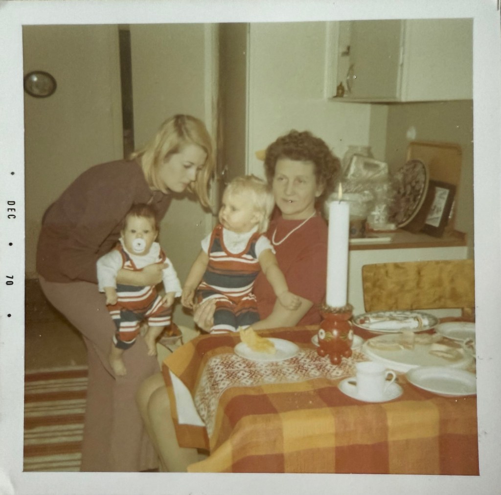 Mamma 21 år, jag med napp, 4 månader, storasyster 1 år och 5 månader, mormor 53 år.