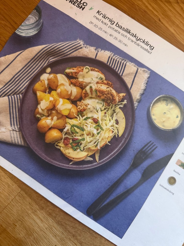 Vi bestämde oss förra veckan för att testa på Hello Fresh och idag kom första leveransen av tre olika rätter. Vi åt en av dem till middag ”Krämig basilikakyckling med kokt potatis och tranbärssallad”.