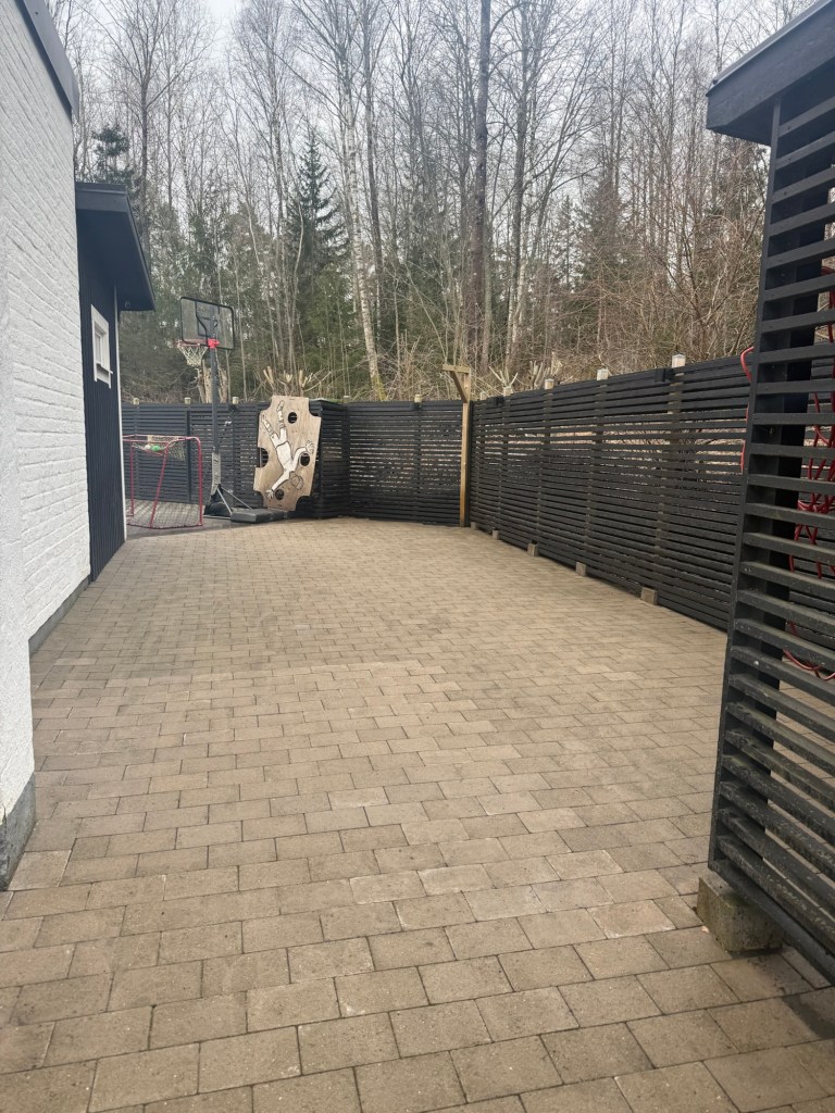 Alla stenplattor på framsidan och gaveln blev tvättade och det gick rätt smidigt (3,5 timmes jobb) förutom allt jobb med att reda ut vattenslangen och elkablarna som hamnade som ett nystan, när jag gick fram och tillbaka på tomten.