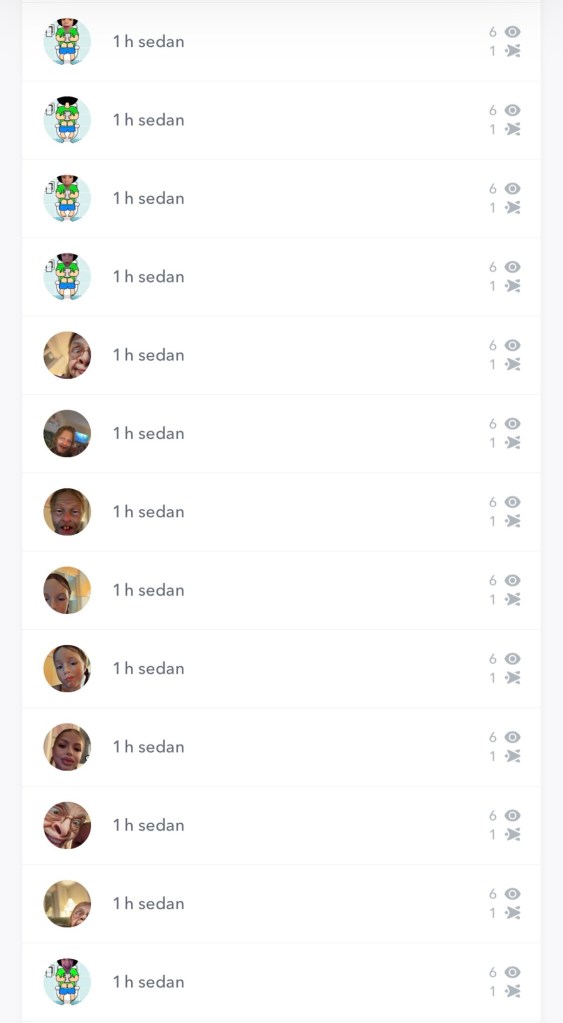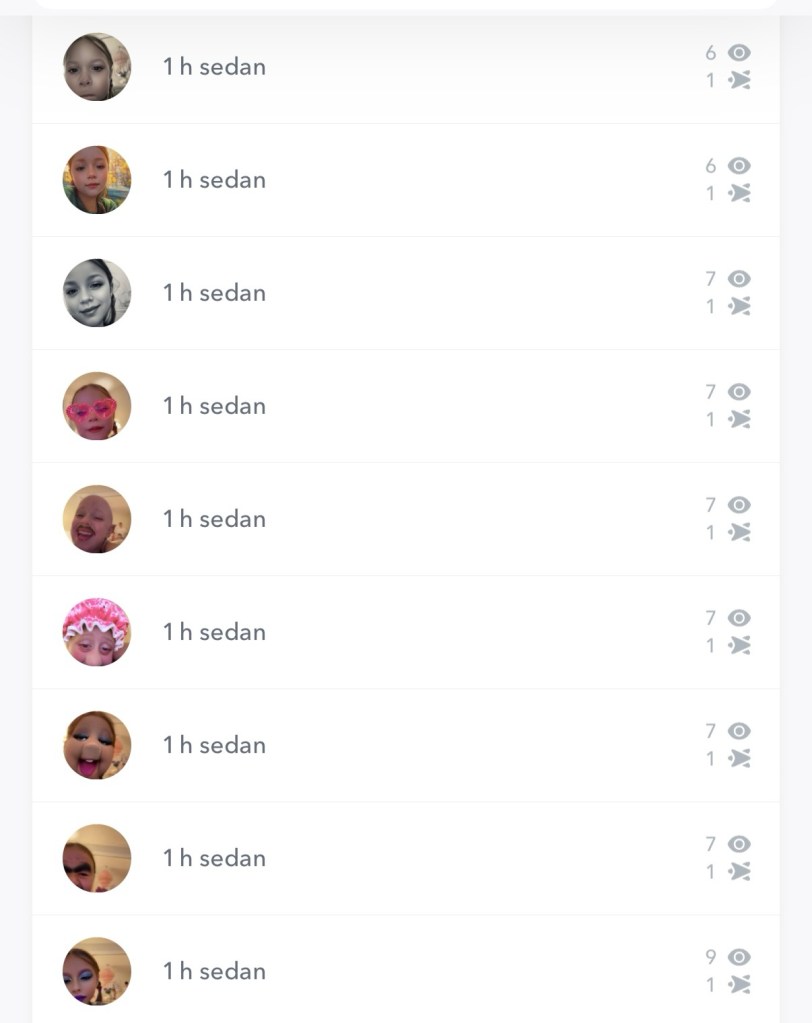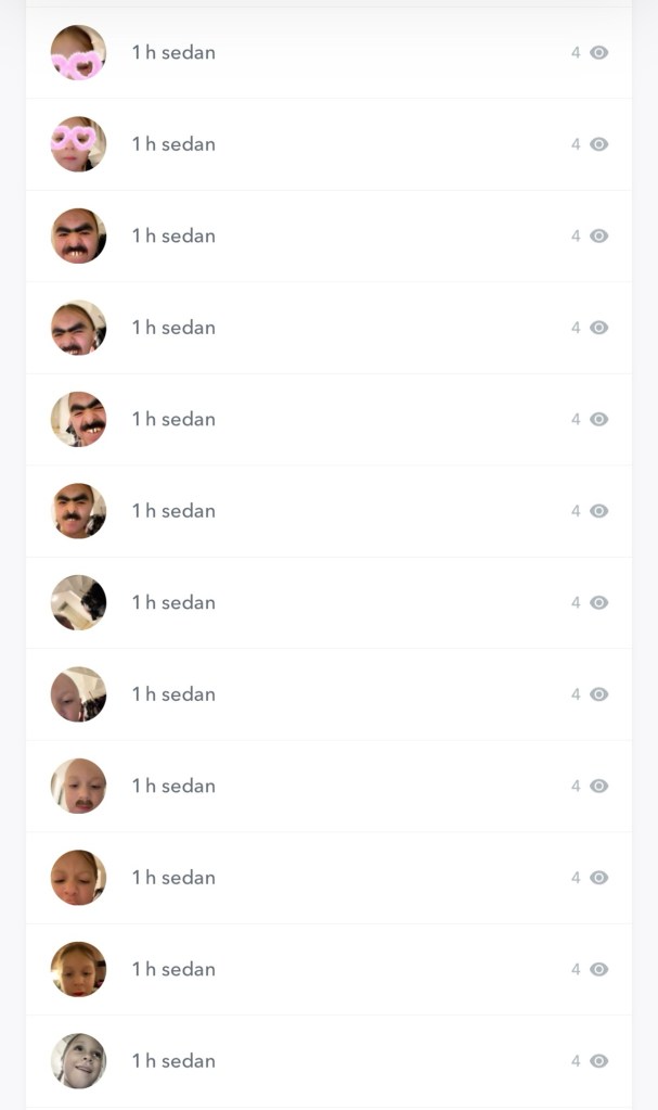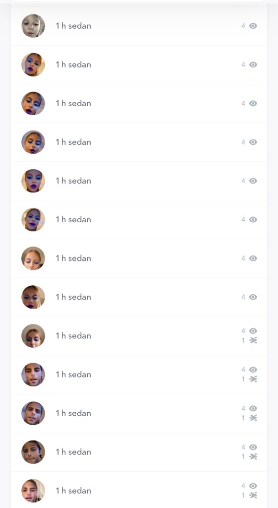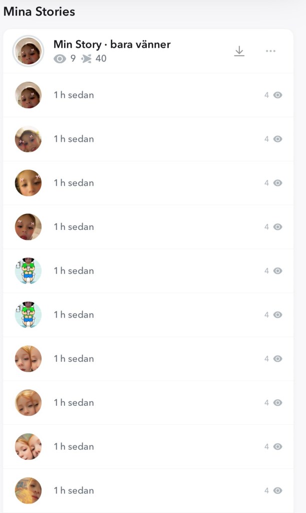 Igår när vi var hos Hanna så hade Ilse min iPhone. Hon fotade och filmade sig själv i olika filter och skepnader. Det var först när jag kom hem som jag märkte att hon lagt ut allt, 70 st storys, på min Snap…