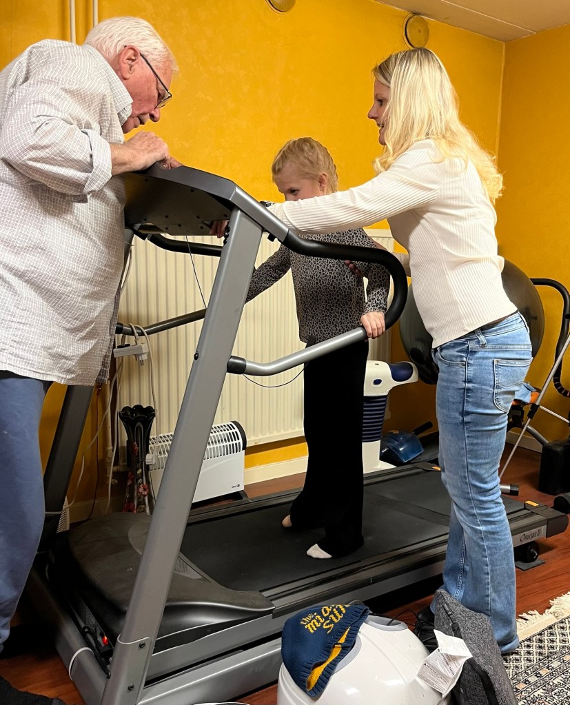 Vi tog en tur till min tidigare bonus-svärfar för att fira hans 88-årsdag med lite fika. Efter fikat testade Tea på att köra ett löpass i hans verkstad. (Fick ett sms från honom idag att han blivit så inspirerad av henne att han själv hade gått på bandet. Det hade inte varit igång på 3 år).