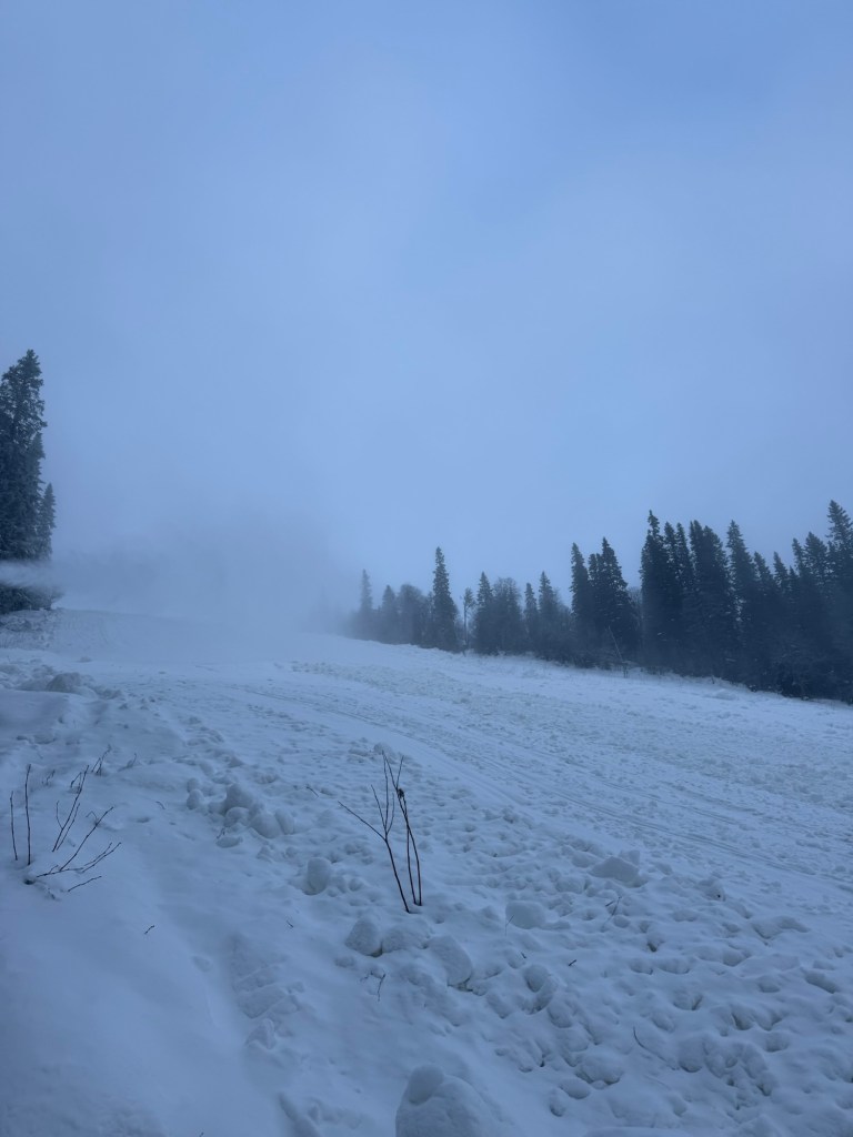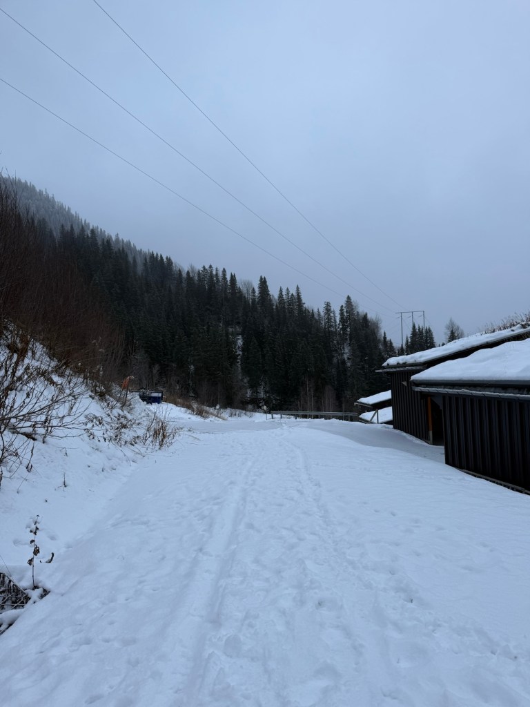 Utan att ens kika på några vandringsleder började vi gå rakt upp mot fjället. Backarna ligger fortfarande stängda för säsongen, vilket märktes direkt. Snökanonerna dundrade på i full kraft och sprutade snö. Underlaget var allt annat än jämnt; vi pulsade genom snödrivor, korsade mellan backarna och tog små omvägar genom skogen.