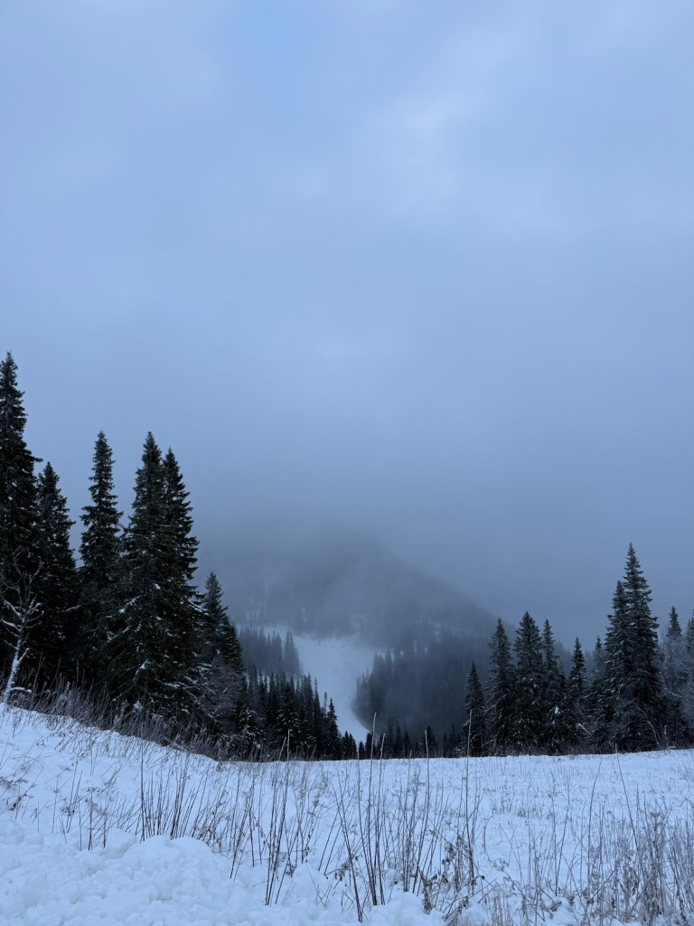 Ju högre upp vi kom, desto mer dimma. Man hade svårt att se var vi en skulle och utan någon plogad väg att följa blev vandringen både tyngre och mer svårorienterad. Vid ungefär 700 meters höjd stannade vi upp, tittade på varandra och insåg att det var klokast att vända om. Toppen får helt enkelt vänta till en dag med bättre sikt.