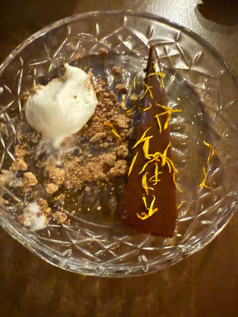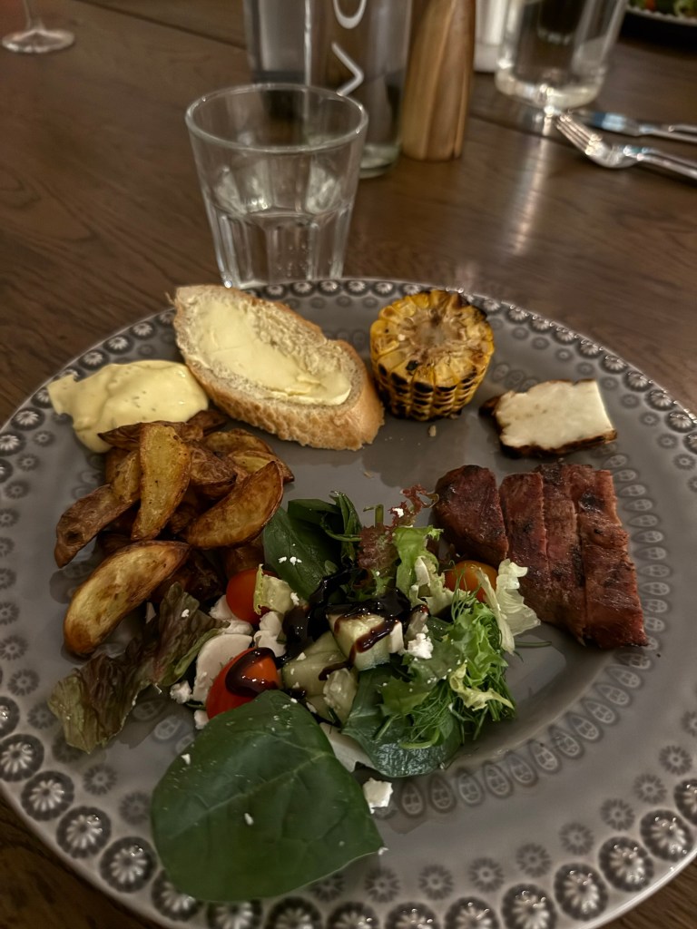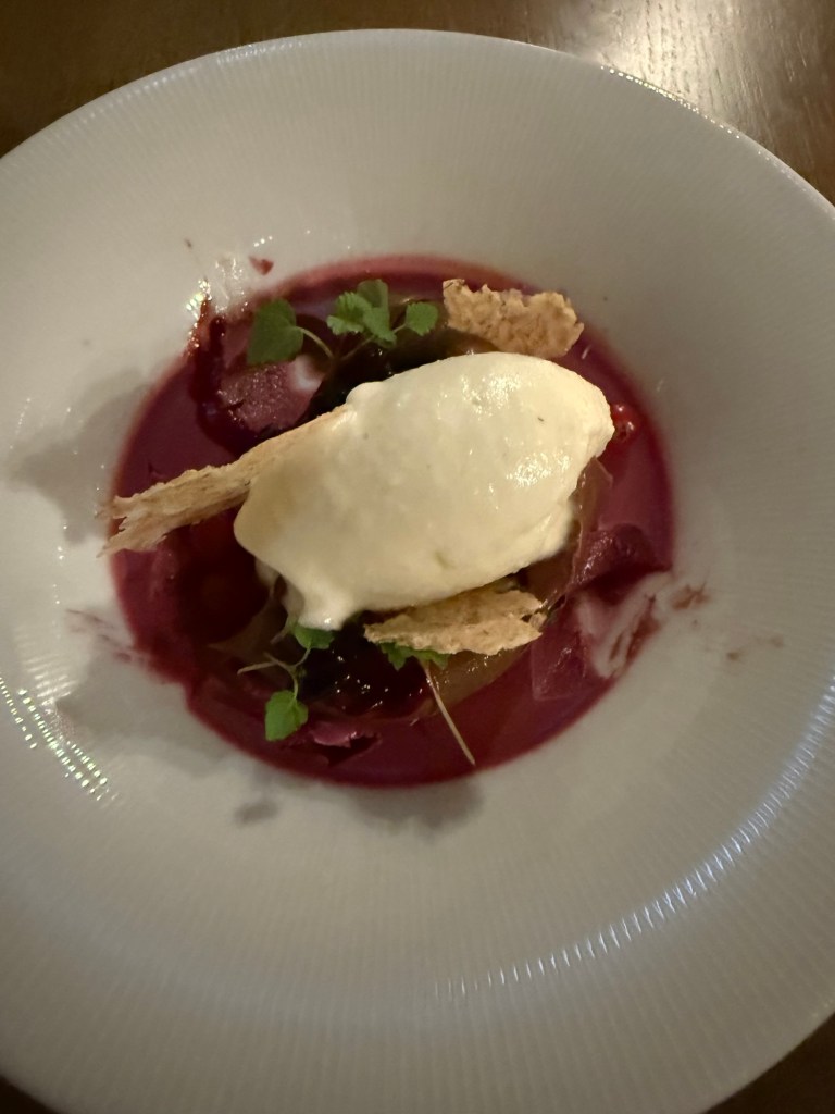 Åt varmrätt och efterrätt i restaurangen. Det blev fish and chips & risotto med regnbåge. Till efterrätt chokladtårta med sorbet & pannacotta.